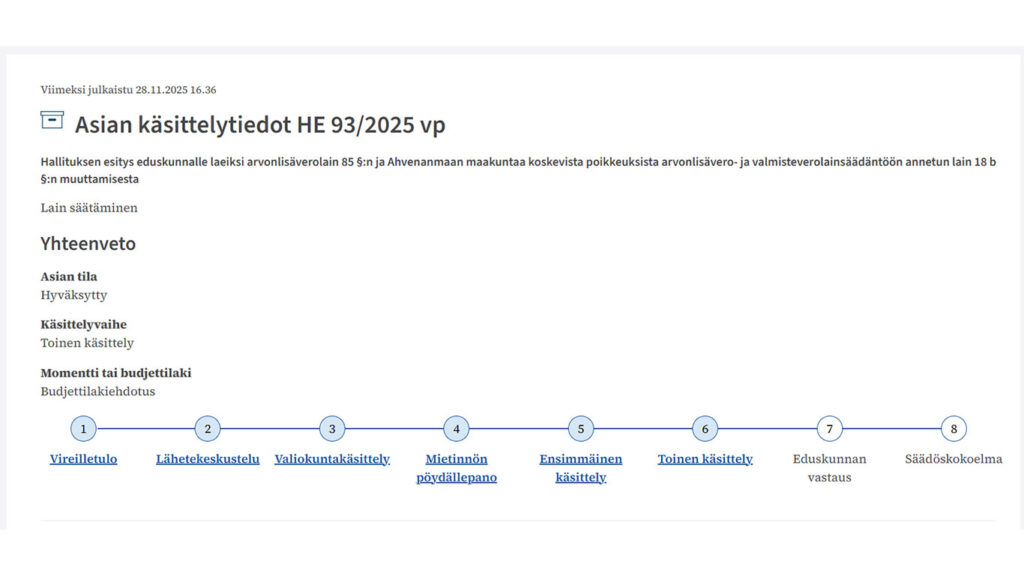 Toinen käsittely eduskunnassa 28.11.2025 – Hallituksen esitys HE 93/2025: Lakimuutos arvonlisäverolain 85 §:ään ja Ahvenanmaan maakuntaa koskeviin poikkeuksiin arvonlisävero- ja valmisteverolainsäädännössä