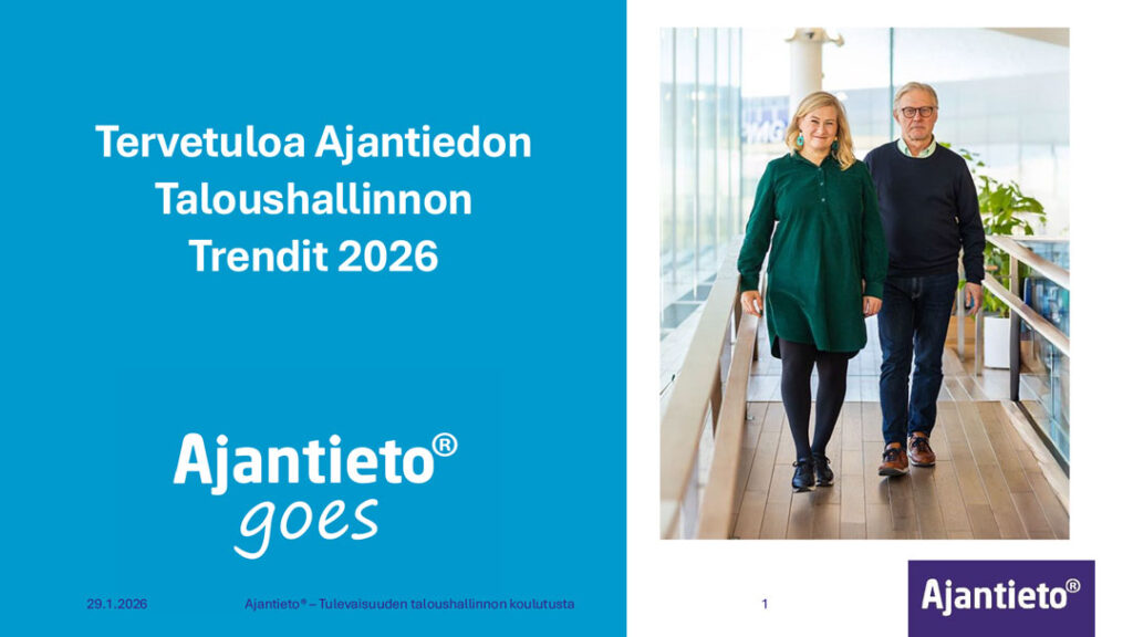 Ajantiedon tehtävä on auttaa taloushallinnon asiantuntijoita kehittymään tässä muutoksessa. Tarjoamme ymmärrystä, näkemyksiä ja työkaluja, jotta muutoksista ei tule kuormittavia – vaan mahdollisuuksia. Olemme mukana matkalla, kun taloushallinnon tulevaisuus rakentuu.